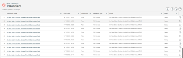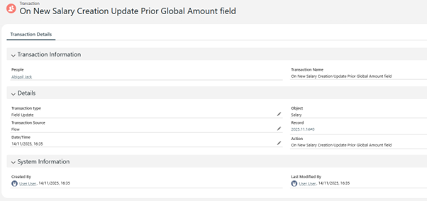 - Step 1: Central transaction log object – Created a dedicated Employee Transaction Log Object as the single source of truth, with key fields to record each action against the corresponding employee.