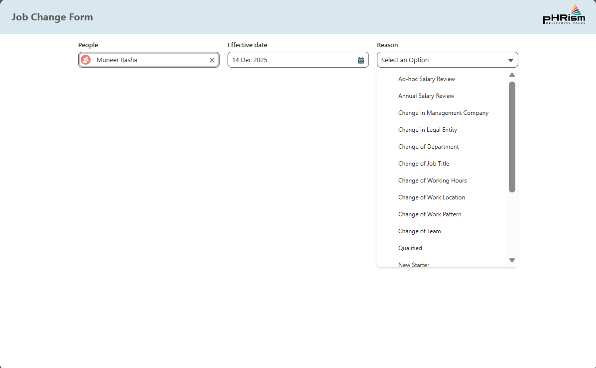 The Job Change Form was introduced in an HR system to simplify and standardise job-related employee transitions, including promotions, transfers, and role modifications. This feature helps HR teams process changes accurately, reduce manual updates, and maintain clean employment history records.