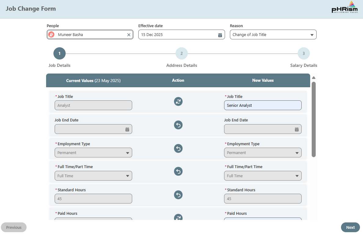 A three-step job change form that reduces manual updates, improves data quality, and keeps job history clean.