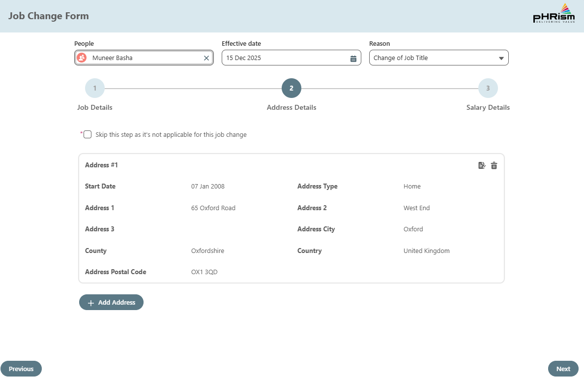 - The main form presents job, address, and salary sections with current values shown alongside editable new values. An action button lets users auto-copy current values into new fields to reduce manual typing and lower error rates. Where a change is not required, skip options allow HR to bypass address and/or salary updates, keeping the experience focused and efficient.