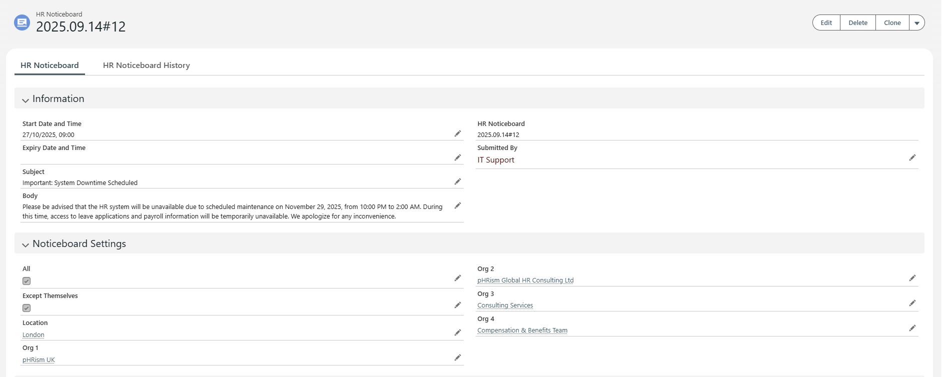 • Clearer governance of HR communications through standardised notice fields and visibility rules